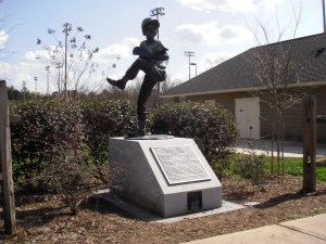 We pulled into Huntersville, NC about 1:30 today, having left Jacksonville at 6:00 a.m. and having enjoyed a wonderful visit with the McClearys. After lunch, we set out to find a ballpark or an empty field on which to play so that we could add North Carolina to the list of states in which we’ve tossed around the old horsehide. As I mentioned yesterday, Huntersville is the birthplace of Hoyt Wilhelm, and we had a sense that there must be something around here somewhere named for the former Oriole. Therefore, we went down an exit, made a left, made a right, generally heading towards the local community college. We found the Huntersville Athletic Complex, which of course, contained a statue of a young ballplayer beneath which was a plaque detailing Wilhelm’s career. The entire baseball area was dedicated to Wilhelm. Let’s just say that we can find ’em like those guys who can find water underground with a divining rod. We played on one of the two synthetic turf baseball fields and furthermore, when we counted up the baseballs at the end of the day, it turns out we found another one of those, too.