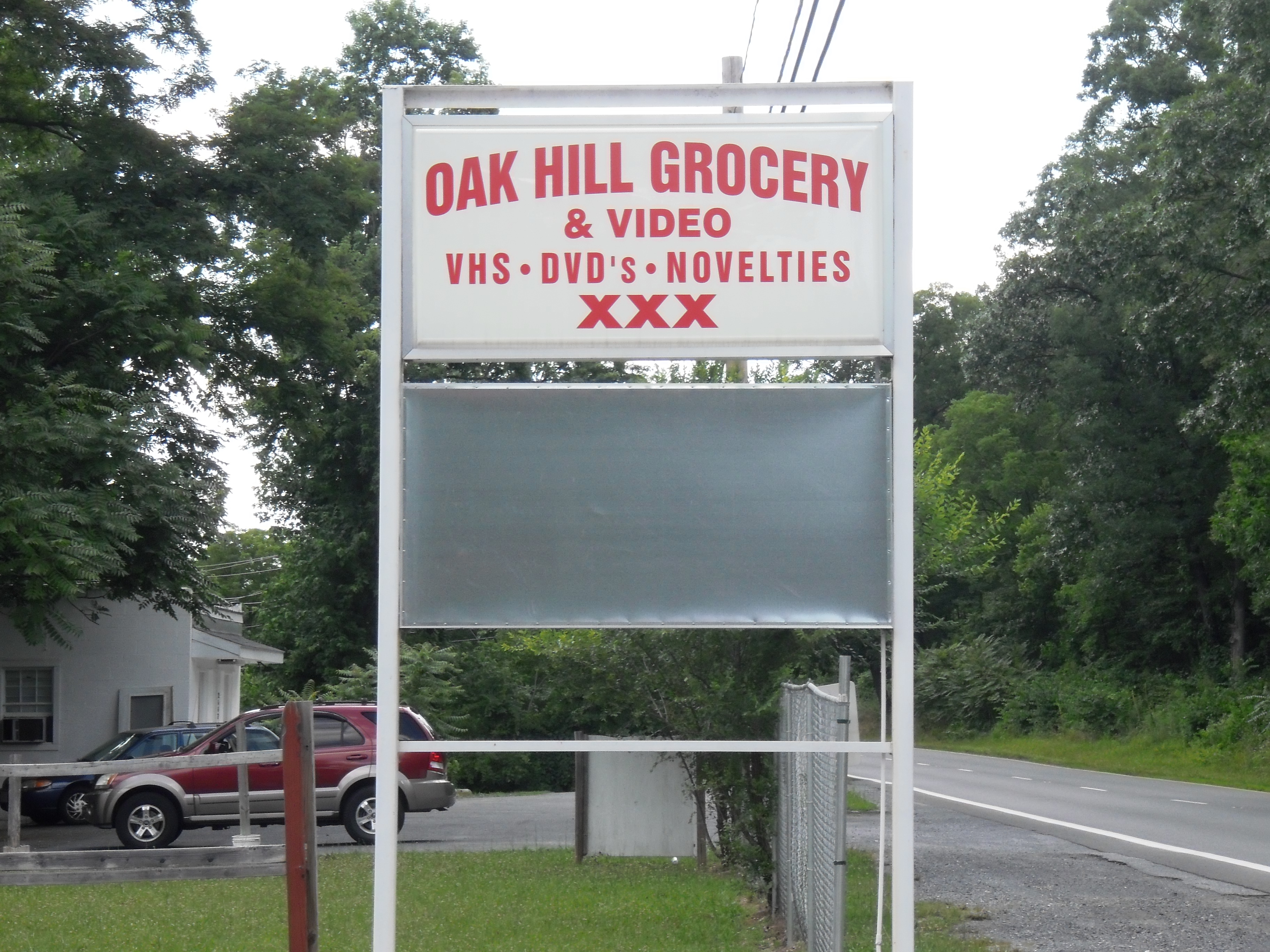 Situated on the right side of Route 7 lies the Oak Hill Grocery although if you read the fine print on the sign they’re a little more than a grocery store. Yes, if you read that sign carefully, you’ll see that this quaint little establishment is actually a grocery store/adult video and novelty store. You don’t see that combination very often, and by “very often,” I mean never–except on Route 7 between Winchester and Berryville.