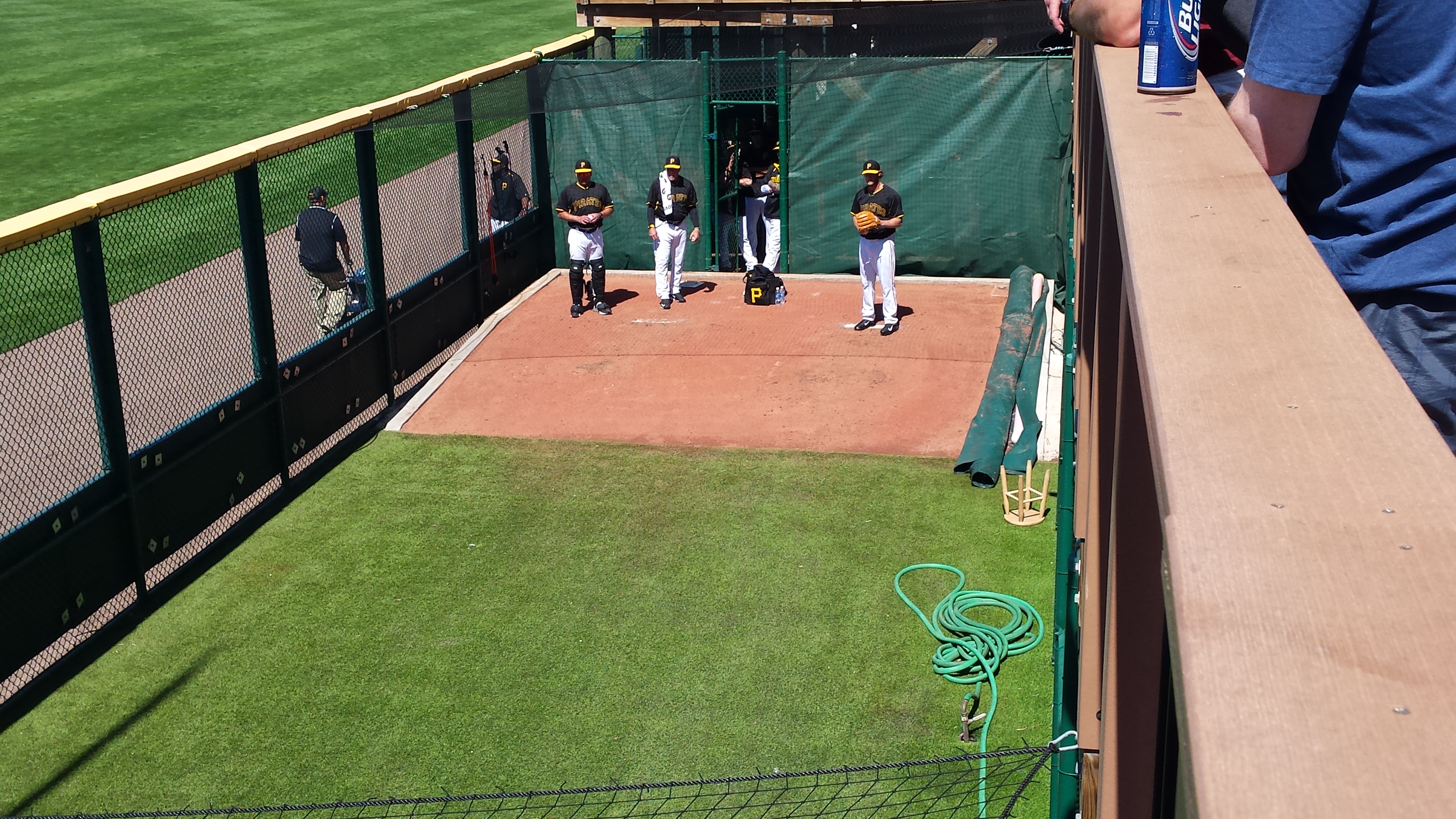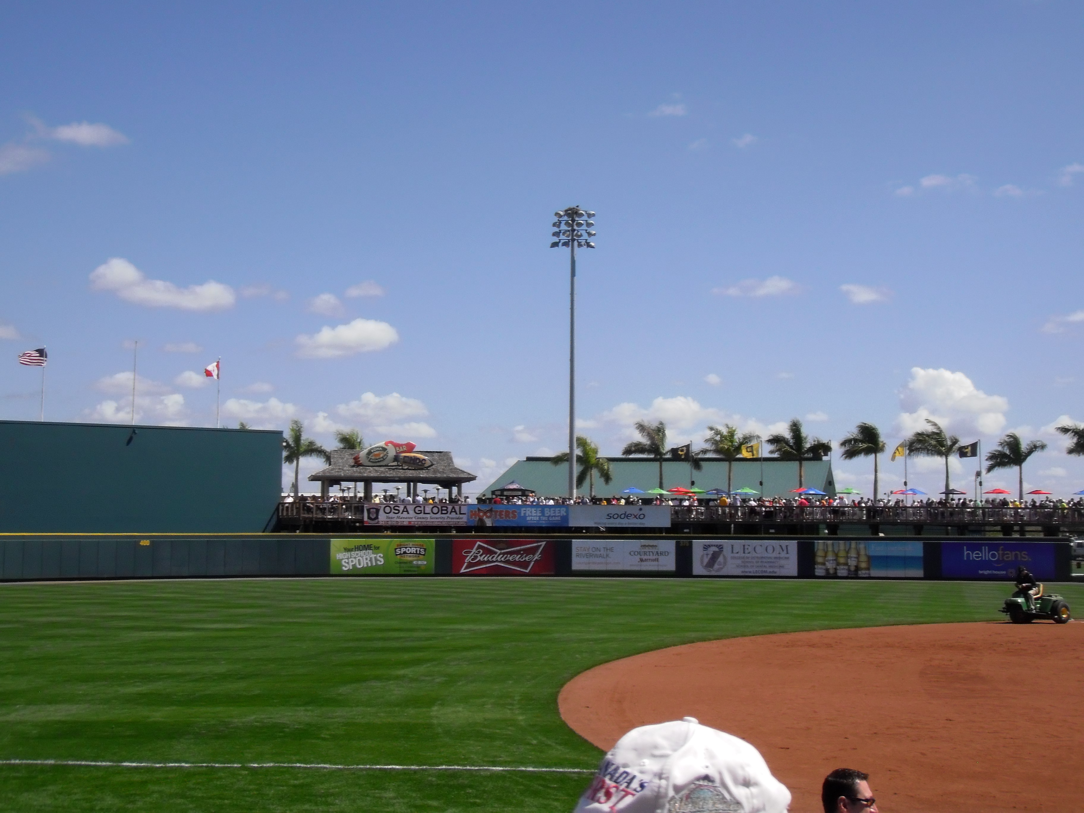 We experienced great weather on our recent trip to Florida: record warmth and widely scattered barbecue. Our day at Joker Marchant Stadium in Lakeland was fun-filled despite the fact that the Orioles lost to the Tigers 15-2. From there, we traveled to Bradenton on the Gulf Coast and saw the Blue Jays beat the Pirates, 4-1 at the latter’s home ballpark, McKechnie Field. McKechnie has been refurbished since Al and I first visited in 2012 (when we also saw the Pirates and Blue Jays play and on the same date. It was déjà vu all over again, as Yogi Berra would say.) A boardwalk has been added above the outfield fence providing a marvelous place to hang out on a sun-splashed day. As you can see from the photo below, you can also look right down into the Pirates’ bullpen.