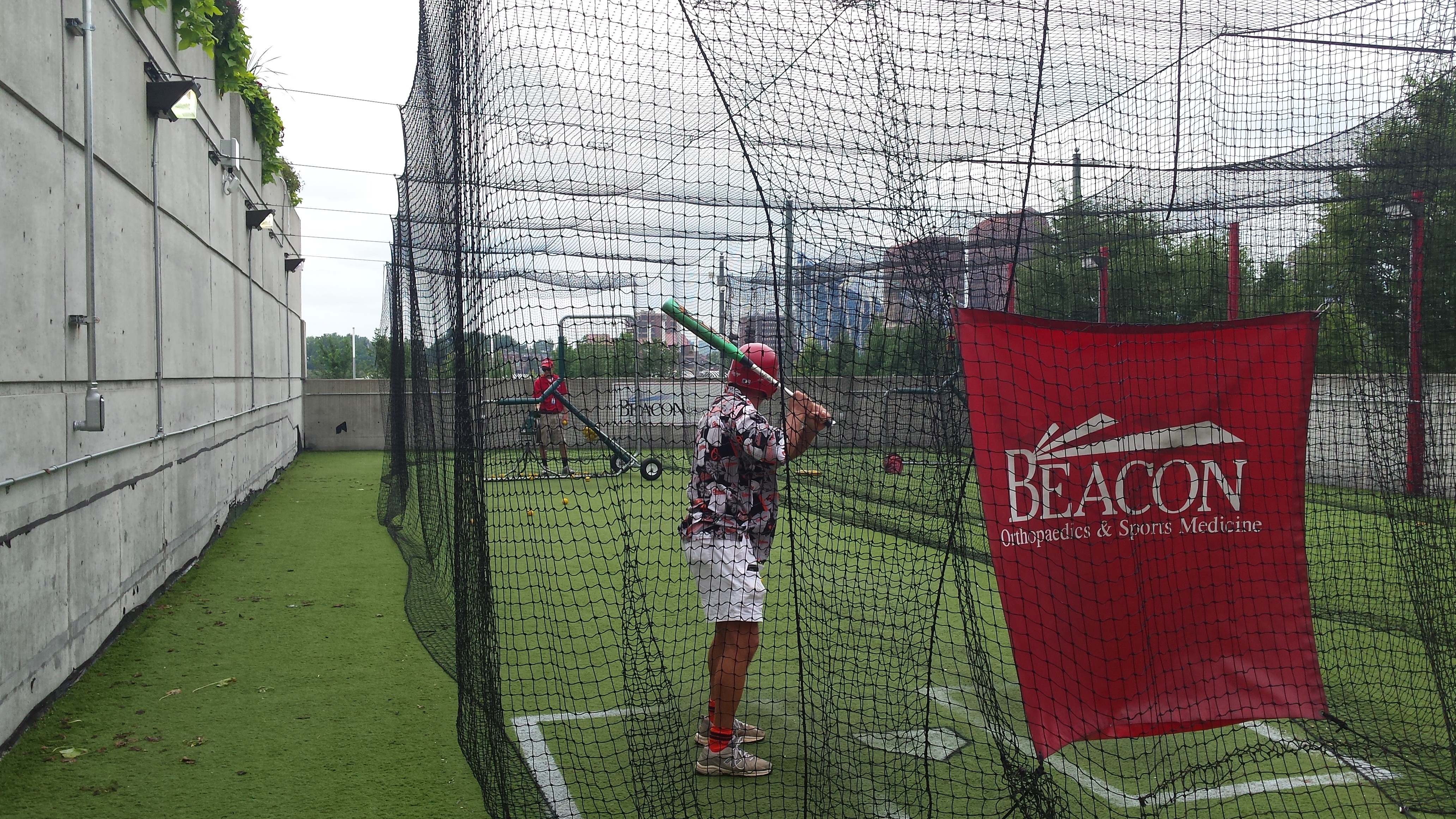 Before the game, we took some swings in the batting cage outside the ballpark proper, which means, therefore, that we have now added Ohio to the places we have played. (Hey, it was all that we could do because we’re pretty sure that they wouldn’t let us play catch in the middle of I-71 although they might have because once again, everyone loved our shirts.