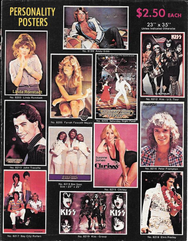 These images are just how I remember these stars, though they are certainly not how they are today. John Travolta has gained weight and Peter Frampton has lost hair—what remains is close cropped and snowy white. Suzanne Somers turns 71, today, October 16th. Linda Ronstadt can no longer sing as a result of her Parkinson’s disease. Only one of the Gibb Brothers, Barry, is still alive. Indeed, Andy, never an official member of the Bee Gees would die ten years after this ad appeared. Farrah Fawcett succumbed to cancer in 2009. Elvis had already died the summer before.